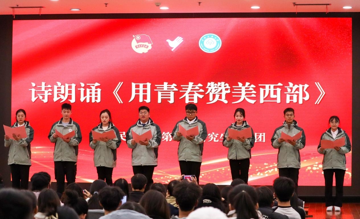 雷竞技官网第26届研究生支教团集体朗诵原创诗歌《用青春赞美西部》。 何涵摄